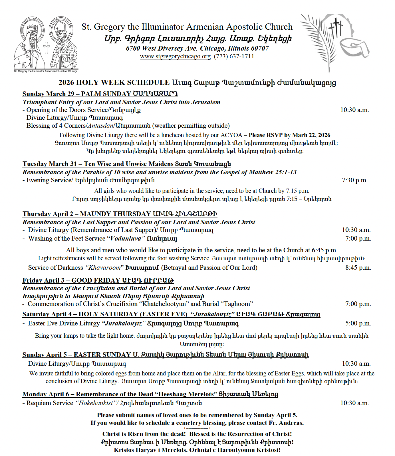 If you have any questions please don’t hesitate to contact pastor Rev. Fr. Andreas Garabedian at fr.andreasg@gmail.com or at the Church 773-637-1711.