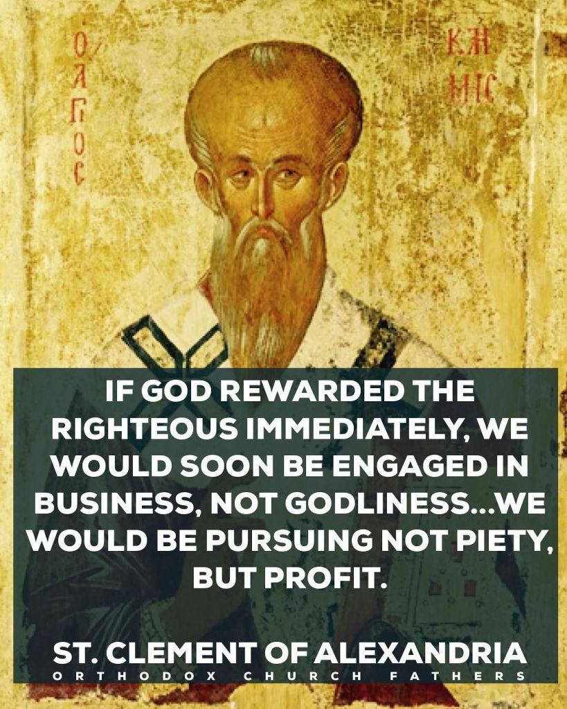 “If God rewarded us immediately the way we wanted, then we would be engaged in business not Godliness…pursuing profit and not piety” – St. Clement of Alexandria. In other words, my dear brothers and sisters, if God gave us what we wanted, when we want it then we would truly be impoverished similar to how if our parents only gave us money rather, then give us the tools, skills and abilities to face life’s challenges. Our relationship would be merely a transaction rather, then communion. Additionally, as the proverb states, “give a man a fish, they eat for the day, teach a man to fish, they will eat their entire life.” It is the same with our faith!