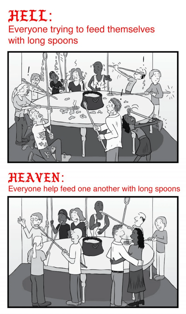 One day, a man kept praying to God to see what heaven and hell were like. In his dream, an angel came to him and said, I will show heaven and hell. Suddenly before the man were two great banquet tables full of food. On the one side, he saw well fed people, full of life. On the other side, he saw pain and misery for no one was eating. When he looked closely, he saw, that each person, on both sides, had a spoon that was almost half the size of their bodies. The ones who were well fed used their spoons to feed each other and so everyone was fed. The ones that looked starved, each tried to feed themselves and the food kept spilling. All you could hear was how those who were starving complain about how unfair it was.