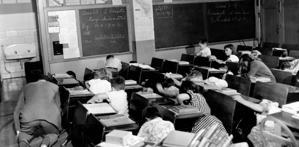 In the early 1950s up until the late 90’s, schools across the United States and Canada trained students to dive under their desks and cover their heads any time they heard the sirens blare. The now-infamous duck-and-cover drills simulated what should be done in case of an atomic attack, which began from the days of the Cold War, as fear filled the lives of people across the world. All throughout the world up until the Iron Curtain fell, fear of a nuclear attack was imminent and very real.