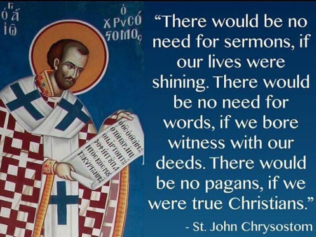 St. John Chrysostom teaches us, “there would be no need for sermons if our lives were shining. There would be no need for words if we bore witness with our deeds. There would be no pagans if we were true Christians.” Each week clergy across Christian denominations and in several languages contemplate what to speak about, what to teach in a sermon. What words can we poetically gather to paint a picture or share a blessing to take away each Sunday morning. Yet, St. John says that we would not need those words or sermons, we would not need clergy to sit there and think about what to teach if only we Christians, clergy, and laity, lived as we were created to be. St. John goes so far as to say there wouldn’t even be pagans, non-believers, if only Christians were true Christians.