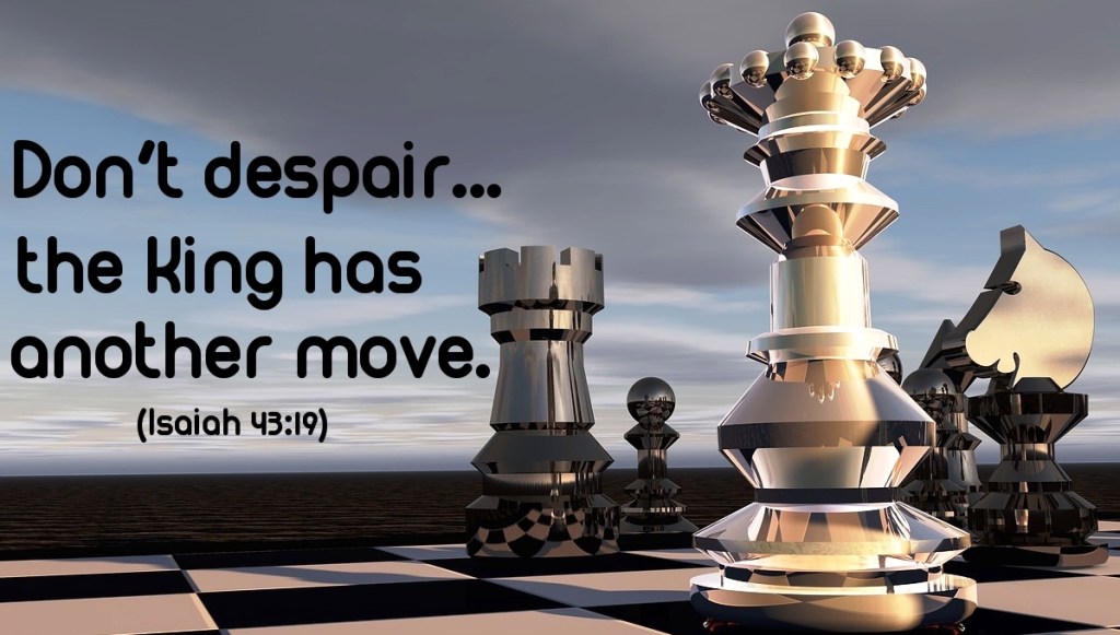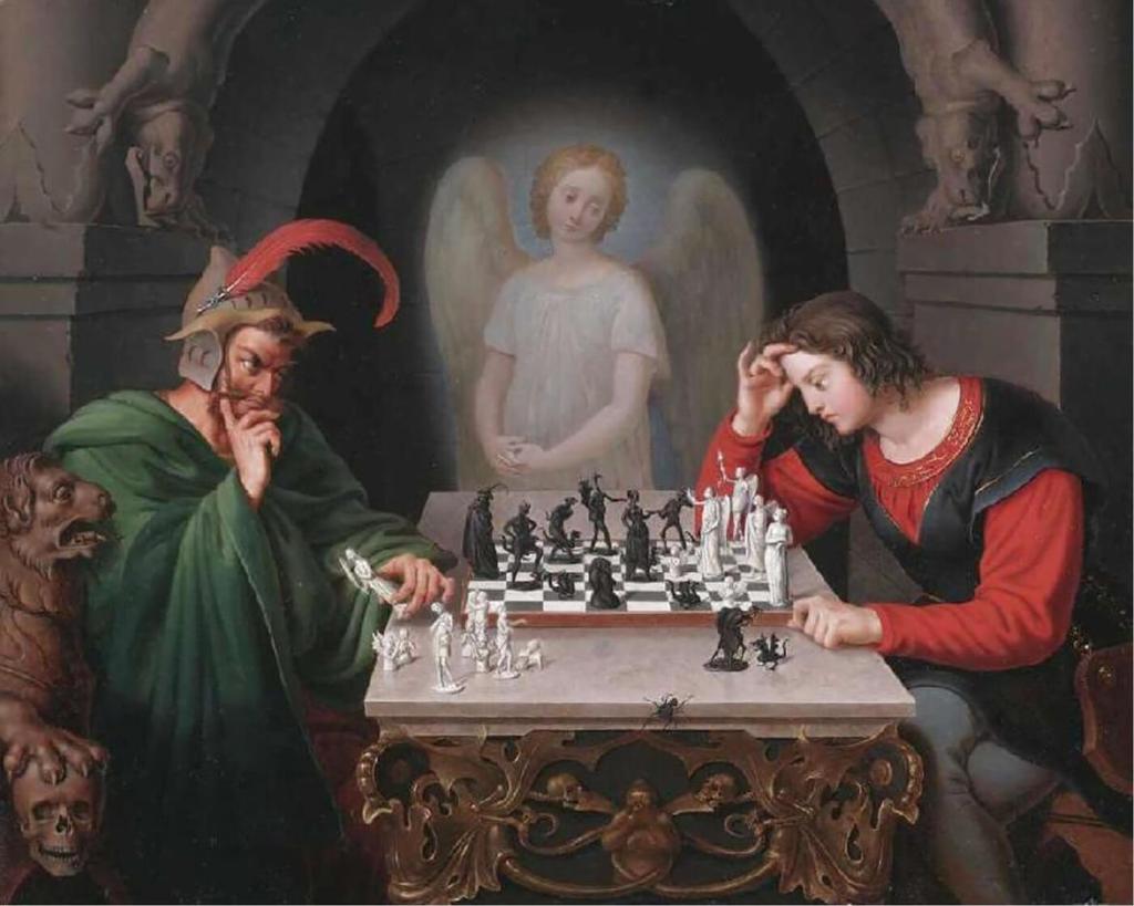 How many of you have seen this painting and know where it comes from? This is known as the painting “checkmate” painted by German painter Friedrich Moritz August Retzsch in the 18th-19thcentury, and it used to hang in the museum of the Louvre in Paris. What do you see in this painting? What stands out? Two individuals playing chess with an angel observing the one player who seems defeated and hopeless. The painter has painted a man playing chess against the devil and from his posture, it is easy to understand that the devil has won; it is checkmate. There is a story that is connected to this painting about a world class grandmaster of chess who was visiting the Louvre with a group and the curator believed the grandmaster would enjoy seeing this painting. And so the group was led to this painting and it was presented as it is. While the group moved on, the guide realized that the grandmaster was not with them and had remained examining the painting. When asked about what was so intriguing, the grandmaster said, either painting must change or the title. The master examined the chess board and said, the player has one more move, it is not checkmate. Though the devil seemed to be the obvious victor, he wasn’t and the man, who thought he was losing, was still able to win. There was one move left was for the King.